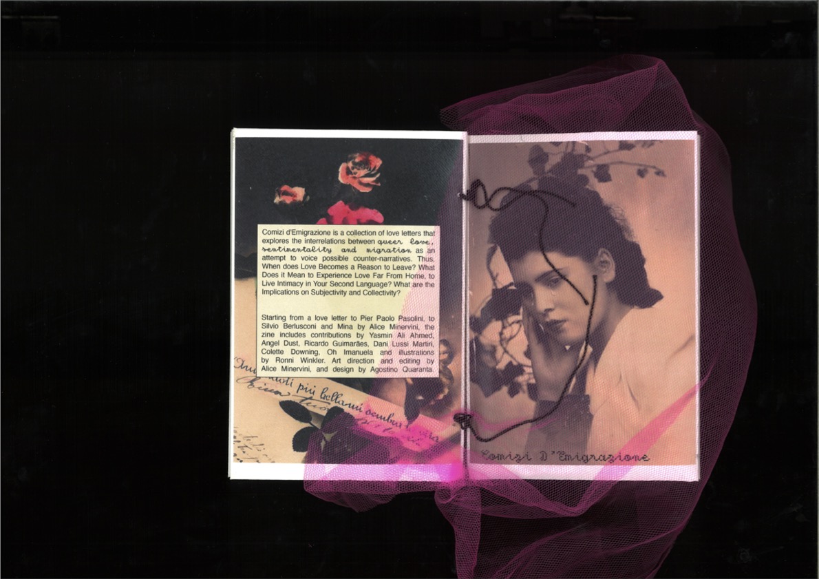 Among her other projects, she co-founded Two Hours Ago I Fell in Love, a performance art festival that reimagines the imaginaries of love, sex, and gender identity within the ruins of a fascist building in Rimini. Minervini also publishes fanzines and artist books, including Comizi d’Emigrazione, a collection of letters exploring the intersections of love, sentimentality, and migration.