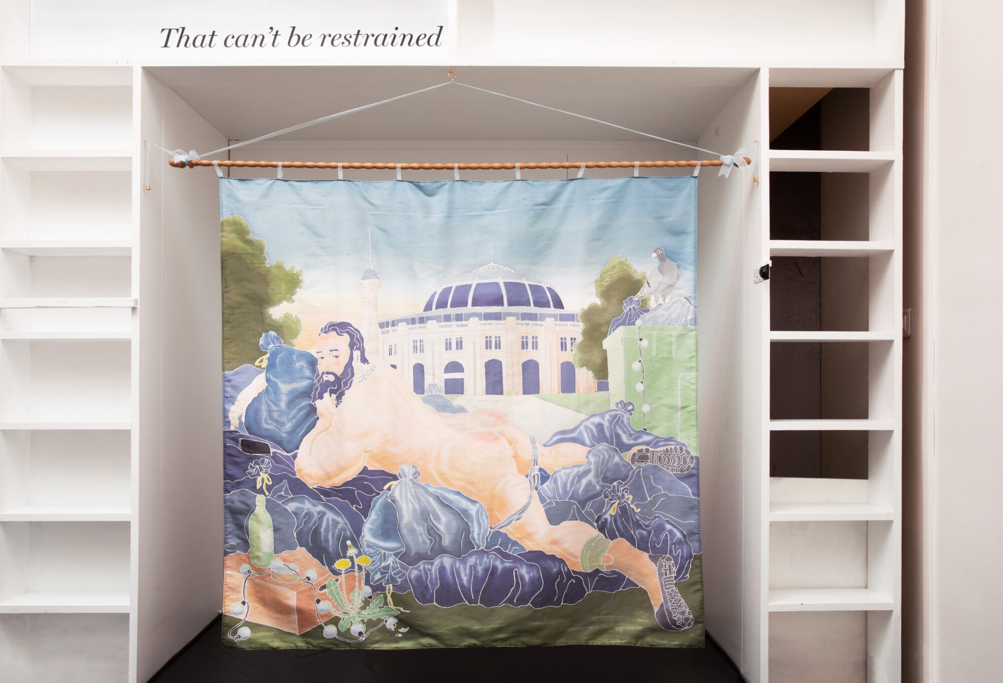 These three tapestries were shown last December at RING, a young independent art space cohabiting with this Persian rug store in the Södermalm district of Stockholm. Left voluntarily on the wall, they were part of an exhibition entitled ‘ANd now she walks on out/ E Uscita’ gathering a choir of artists who came to rethink the history of these visual dispossessions. Some of the works were deemed obscene and scandalized the owner, who demanded that the exhibition be taken down early. This gesture of authority was, in subtext, a statement of the ability of certain representations to capture the viewer, whereas others, by dint of being circulated, seem to have cancelled out all critical possibilities. Because one recognizes these odalisques, these views of postcards; one finds them in the canons of the history of the art, the classics of the cinema, the kitsch of manufactured objects. They function as symptoms: those of a visual culture that disseminates fantasized representations, in spite of the bodies that concern them. At the same time, the image immobilizes and anonymizes the model; it supposes and perpetuates a pseudo-passivity of the “muse” in front of those who contemplate her. Underneath these elongated silhouettes, stretched out like mute invitations, we should perhaps see something else; we should hear this feeling that stirs from the cave that some bodies have created in their belly: violence. The one that is like oil, a substrate of decomposed memory, of dead flesh. It seeps through the skin and, because it is already death upon death upon death, it causes the decomposition of our own contours. Our capacity to love. Another view should be captured: women, static, while this tornado, as old as the world, seeps into them.