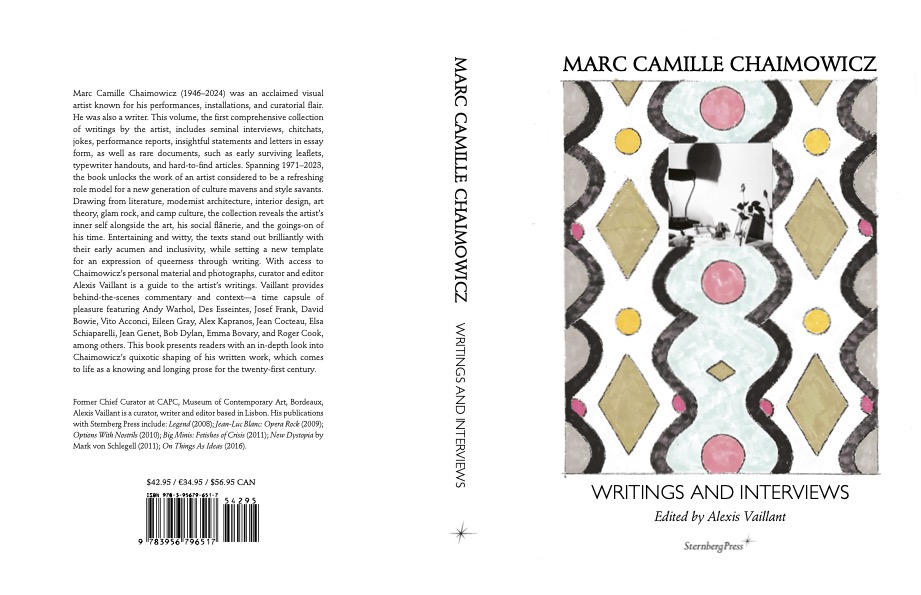 Marc Camille Chaimowicz (1946–2024) is an acclaimed visual artist known for his performances, installations, and curatorial flair. He was also a writer. This volume, the first comprehensive collection of writings by the artist, includes seminal interviews, chitchats, jokes, performance reports, insightful statements and letters in essay form, as well as rare documents, such as early surviving leaflets, typewriter handouts, and hard-to-find articles. Spanning 1971–2023, the book unlocks the work of an artist considered to be a refreshing role model for a new generation of culture mavens and style savants. Drawing from literature, modernist architecture, interior design, art theory, glam rock, and camp culture, the collection reveals the artist’s inner self alongside the art, his social flânerie, and the goings-on of his time. […] Editor Alexis Vaillant provides behind-the-scenes commentary and context—a time capsule of pleasure featuring Andy Warhol, Des Esseintes, Josef Frank, David Bowie, Vito Acconci, Eileen Gray, Alex Kapranos, Jean Cocteau, Elsa Schiaparelli, Jean Genet, Bob Dylan, Emma Bovary, and Roger Cook, among others.