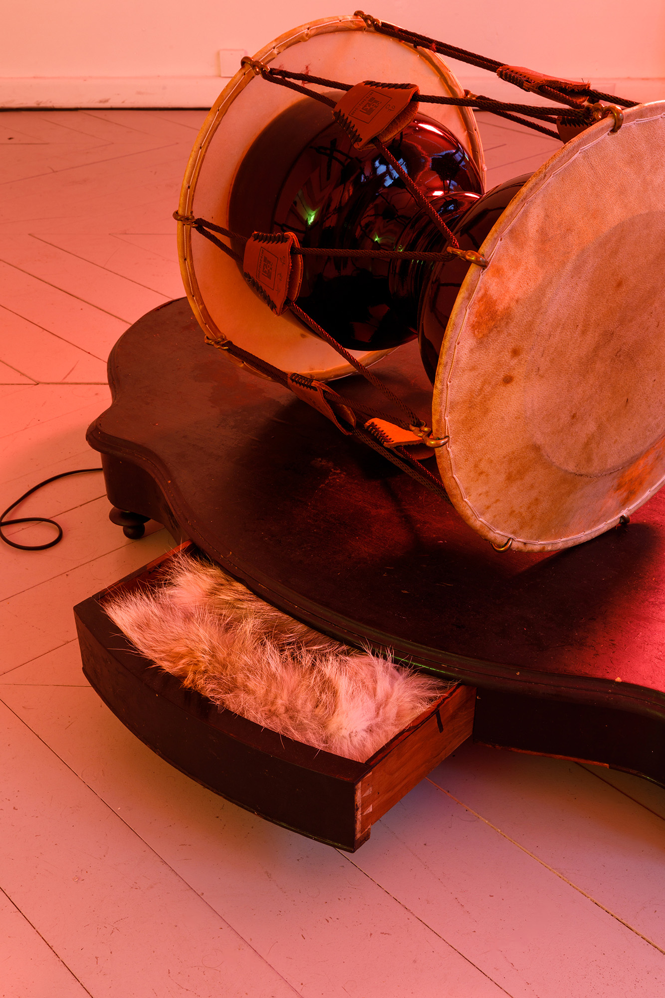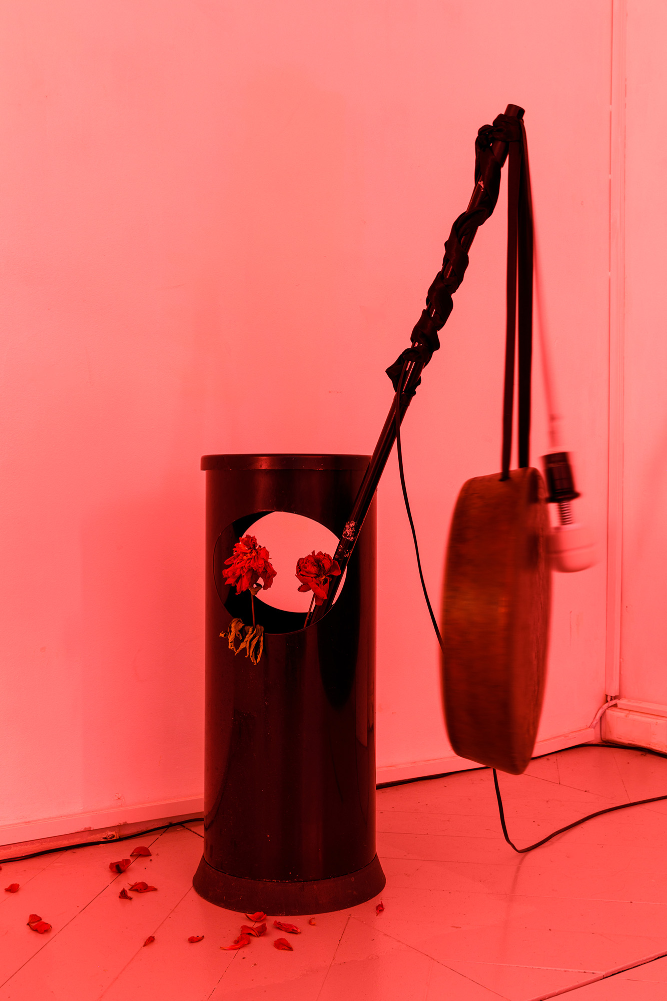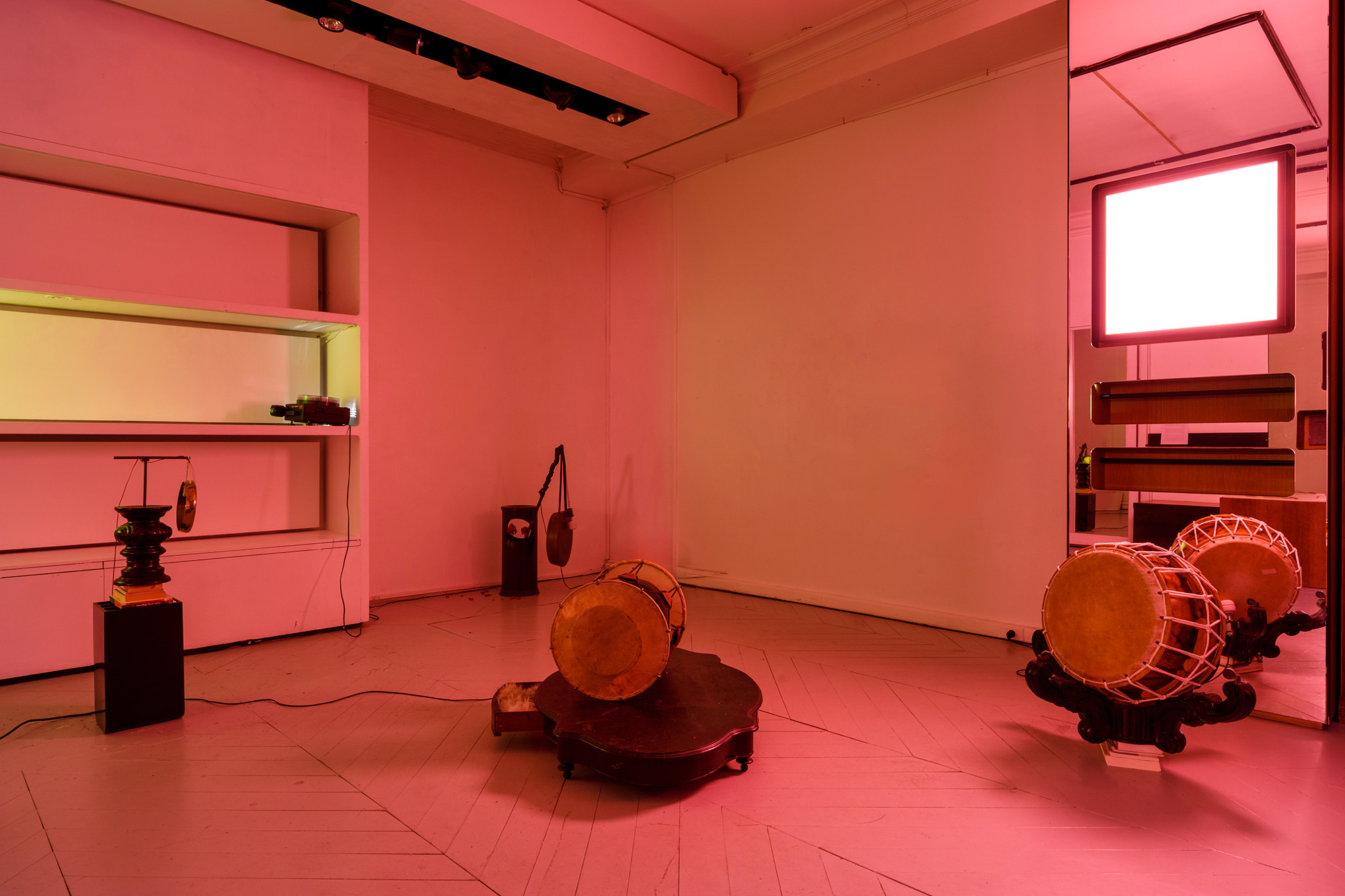 Mira Mann combines these instruments with objects gathered during their stay in Paris, making them resonate, chime, and buzz with the help of motors — some of which come from Magic Wand® vibrator heads. These tools of dissent, entertainment, invocation, or ecstasy become unbalanced in a concert of automated pulses, performed by the sculptures themselves. Like a metronome keeping time, a slide carousel projects images of a rehearsal of 부채춤 [buchaechum], the fan dance — a neo-traditional choreography created in the 1950s. The fragmentation of the filmed sequence disrupts the fluidity of the dance and unsettles the gaze that seeks to fix it. Pink, orange, green, and yellow tones — drawn from the peony motifs of the fan — gradually saturate the space, intoxicating the atmosphere with their acidic hues (toxic pink).