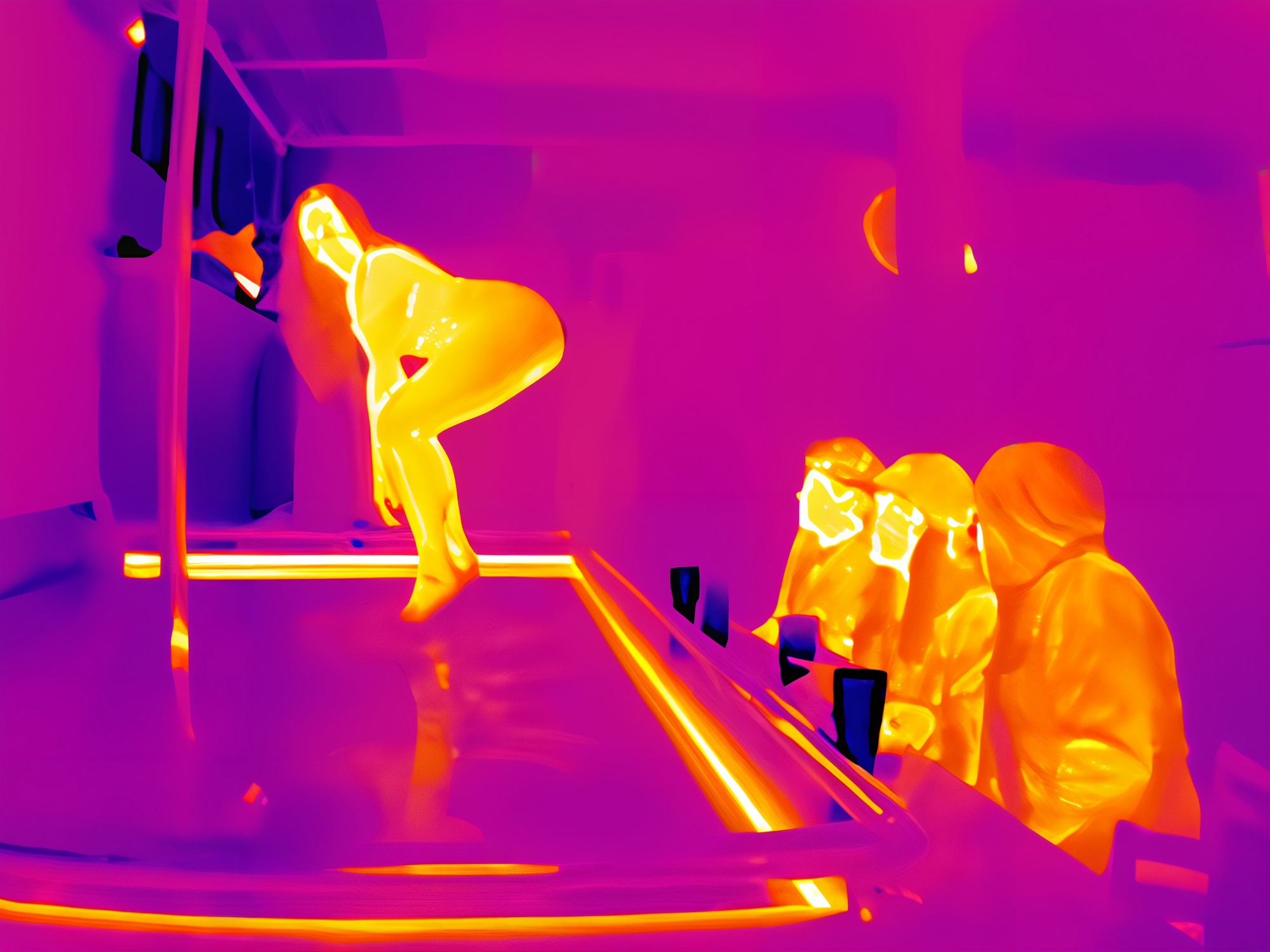 No longer a direct participant but an observer of the transactions between dancers and clients, Toloui explores how issues of consent play out in the crowded environment of a strip club, preserving anonymity by using a thermal imaging camera — a technology typically employed to detect the heat signatures of buildings or machinery. “Stripping away the visual noise of normal life to show just our core heat […] the images expose the invisible transference of yearning that money carries. It is a potent symbol of the patriarchy and its brother, capitalism.” (Toloui) Cash, too, is only visible for as long as it retains the warmth of the person who just held it.